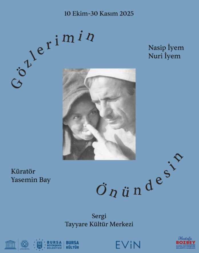 Anadolu’dan, geçmişin köklü uygarlıklarından yola çıkarak ortaya koydukları yapıtlarla bu toprağın sesi olan sanatçı çiftin “Gözlerimin Önündesin” sergisi, Nasip ve Nuri İyem’in sanatlarında ve yaşamlarında birbirlerine duydukları derin sevgiye, Anadolu’ya ve insana olan bağlılıklarına bir saygı duruşu niteliği taşıyor. Serginin, derin bir bağlılığa vurgu yapan başlığı, çiftin birbirlerinin daima zihninde ve kalbinde var olduğuna, hem hayata hem sanata bakma hallerine işaret ediyor. Tayyare Kültür Merkezi’nde düzenlenen sergi kapsamında Nasip İyem’in seramik ve pişmiş toprak yapıtları Cemal Nadir Sanat Galerisi’nde, Nuri İyem’in resimleri Sami Güner Sanat Galerisi Galerisi’nde, çiftin aile fotoğrafları ise orta fuaye alanında sanatseverlerle buluşuyor. Sergiyle eşzamanlı olarak Bursa Büyükşehir Belediyesi’nce yayımlanan kitapta ise küratör Yasemin Bay’ın sergiyi detaylandıran yazısının yanı sıra Zeynep Oral, Selçuk Altun, Feyyaz Yaman, Osman Nuri İyem ve Gizem Kâhya İyem’in metinleri yer alıyor.